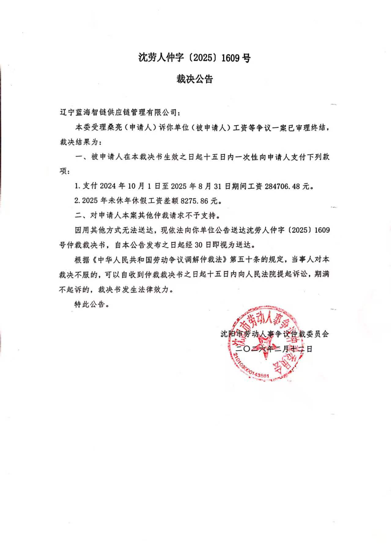 因用其他方式无法送达,现依法向你单位公告送达沈劳人仲字〔2025〕1609号仲裁裁决书,自本公告发布之日起经30日即视为送达。