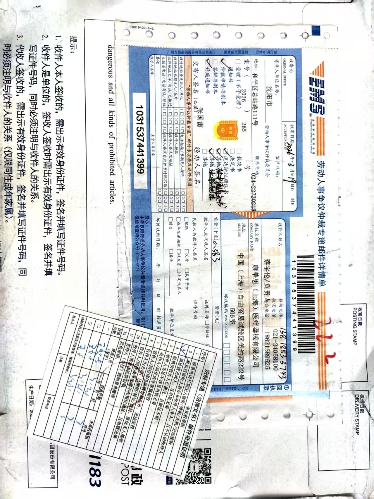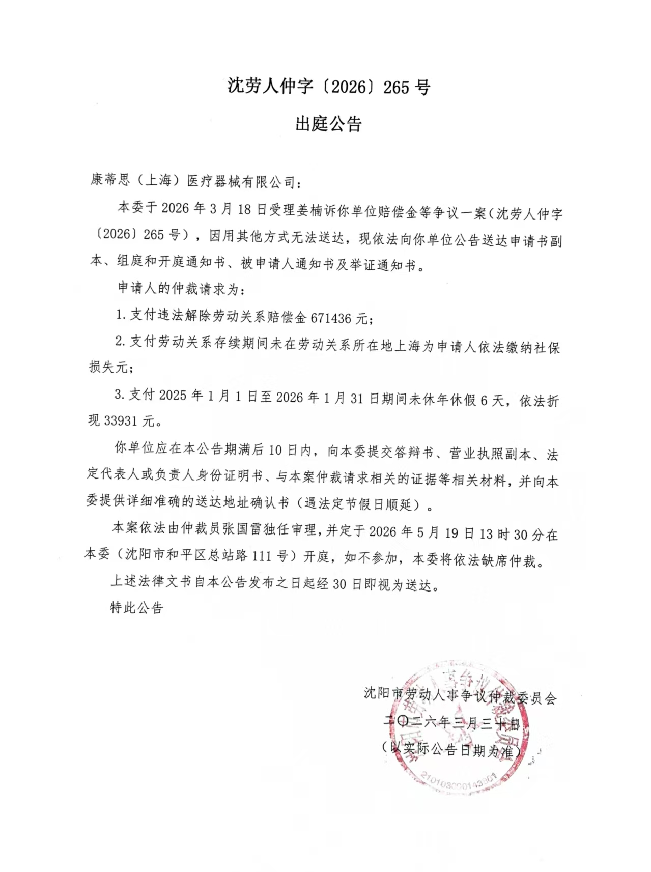 本委于2026年3月18日受理姜楠诉你单位赔偿金等争议一案(沈劳人仲字〔2026〕265号),因用其他方式无法送达,现依法向你单位公告送达申请书副本、组庭和开庭通知书、被申请人通知书及举证通知书。