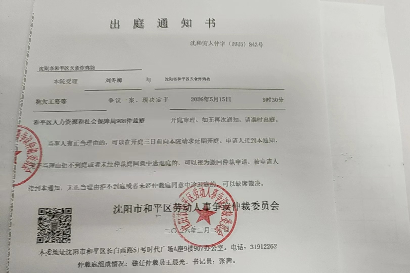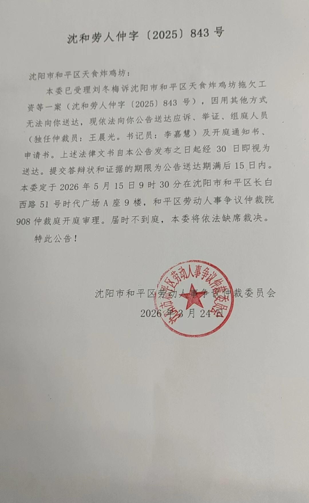 本委已受理刘冬梅诉沈阳市和平区天食炸鸡坊拖欠工资等一案(沈和劳人仲字〔2025〕843号),因用其他方式无法向你送达,现依法向你公告送达应诉、举证、组庭人员(独任仲裁员:王晨光。书记员:李嘉慧)及开庭通知书、申请书。上述法律文书自本公告发布之日起经30日即视为送达。提交答辩状和证据的期限为公告送达期满后15日内。本委定于2026年5月15日9时30分在沈阳市和平区长白西路51号时代广场A座9楼,和平区劳动人事争议仲裁院908仲裁庭开庭审理。届时不到庭,本委将依法缺席裁决。