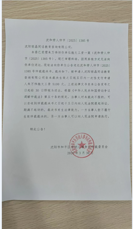 本委已受理朱万伟诉你单位拖欠工资一案(沈和劳人仲字〔2025〕1385号),现已审理终结。因用其他方式无法向你单位送达,现依法向你单位公告送达沈和劳人仲字〔2025〕1385号仲裁裁决书。裁决如下:被申请人沈阳丽晶同话教育咨询有限公司自本裁决生效之日起五日内一次性支付申请人朱万伟拖欠工资5100元。上述法律文书自本公告发布之日起经30日即视为送达。根据《中华人民共和国劳动争议调解仲裁法》第五十条的规定,当事人对本裁决不服的,可以自收到仲裁裁决书之日起十五日内向人民法院提起诉讼,期满不起诉的,裁决书发生法律效力。一方当事人拒不履行生效仲裁裁决的,另一方当事人可以向人民法院申请执行。