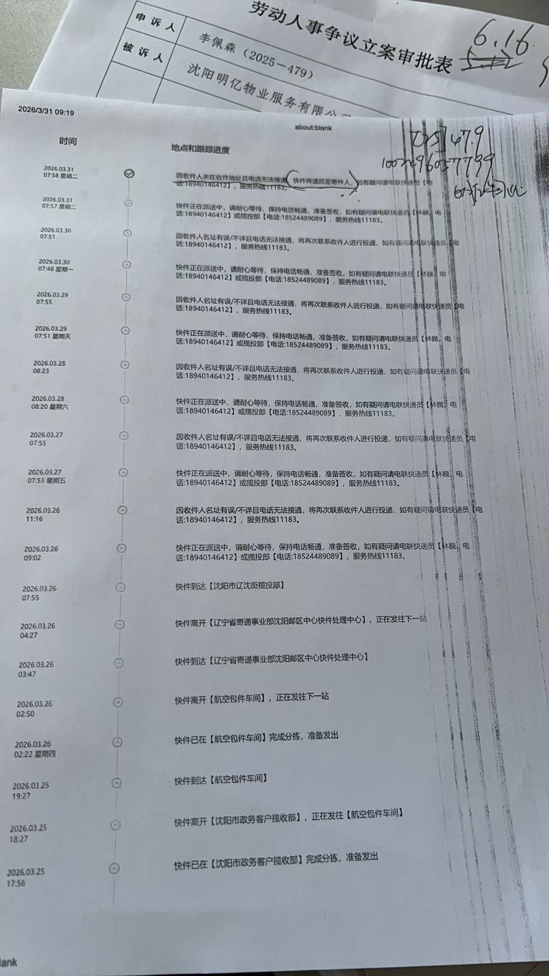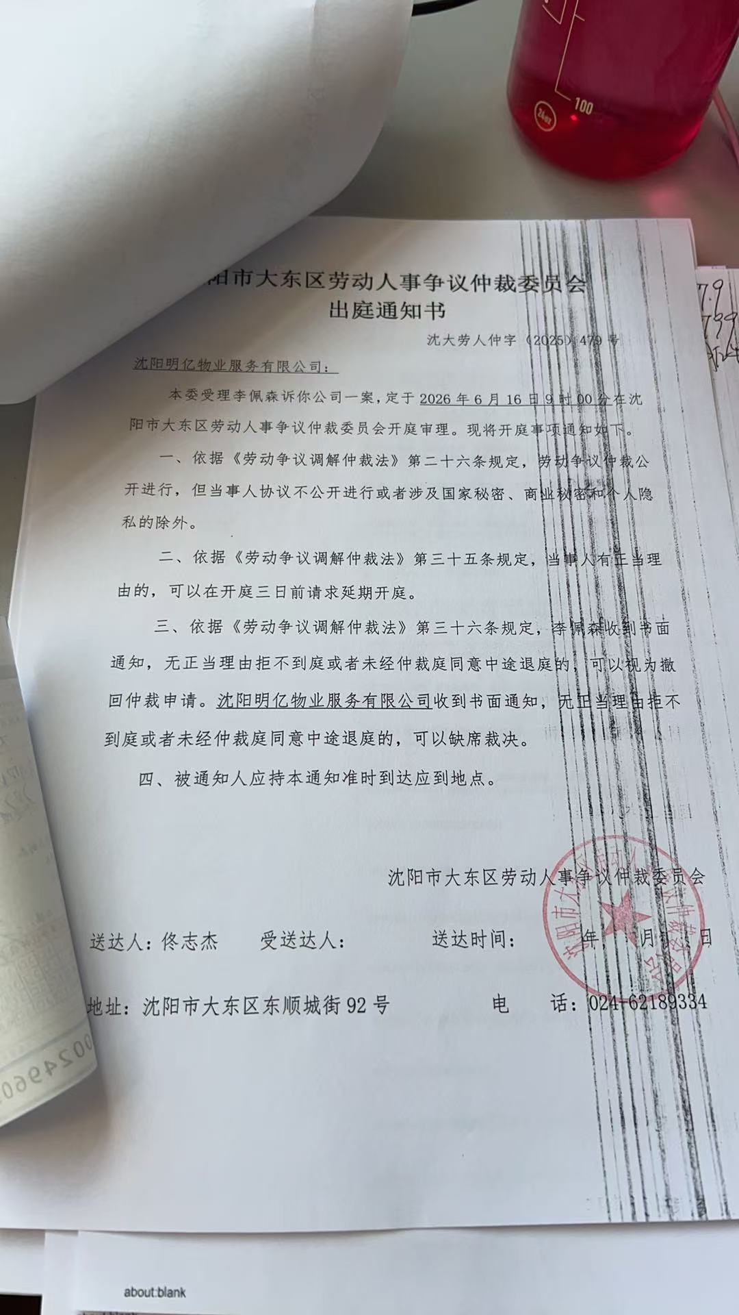 本委已受理李佩森诉你单位劳动报酬等争议一案(沈大劳人仲字〔2025〕第479号),因用其他方式无法向你单位送达,现依法向你公司公告送达应诉、举证、组庭人员(首席仲裁:佟志杰,仲裁员:马锡峰张白羽,书记员:李珠君)及开庭通知书、申请书。上述法律文书自本公告发布之日起经30日即视为送达。提交答辩状和证据的期限为公告送达期满后15日内。本委定于2026年6月16日9时00分在沈阳市大东区东顺城街92号,大东区劳动人事争议仲裁院二楼仲裁庭217室开庭审理。届时不到庭,本委将依法缺席裁决。