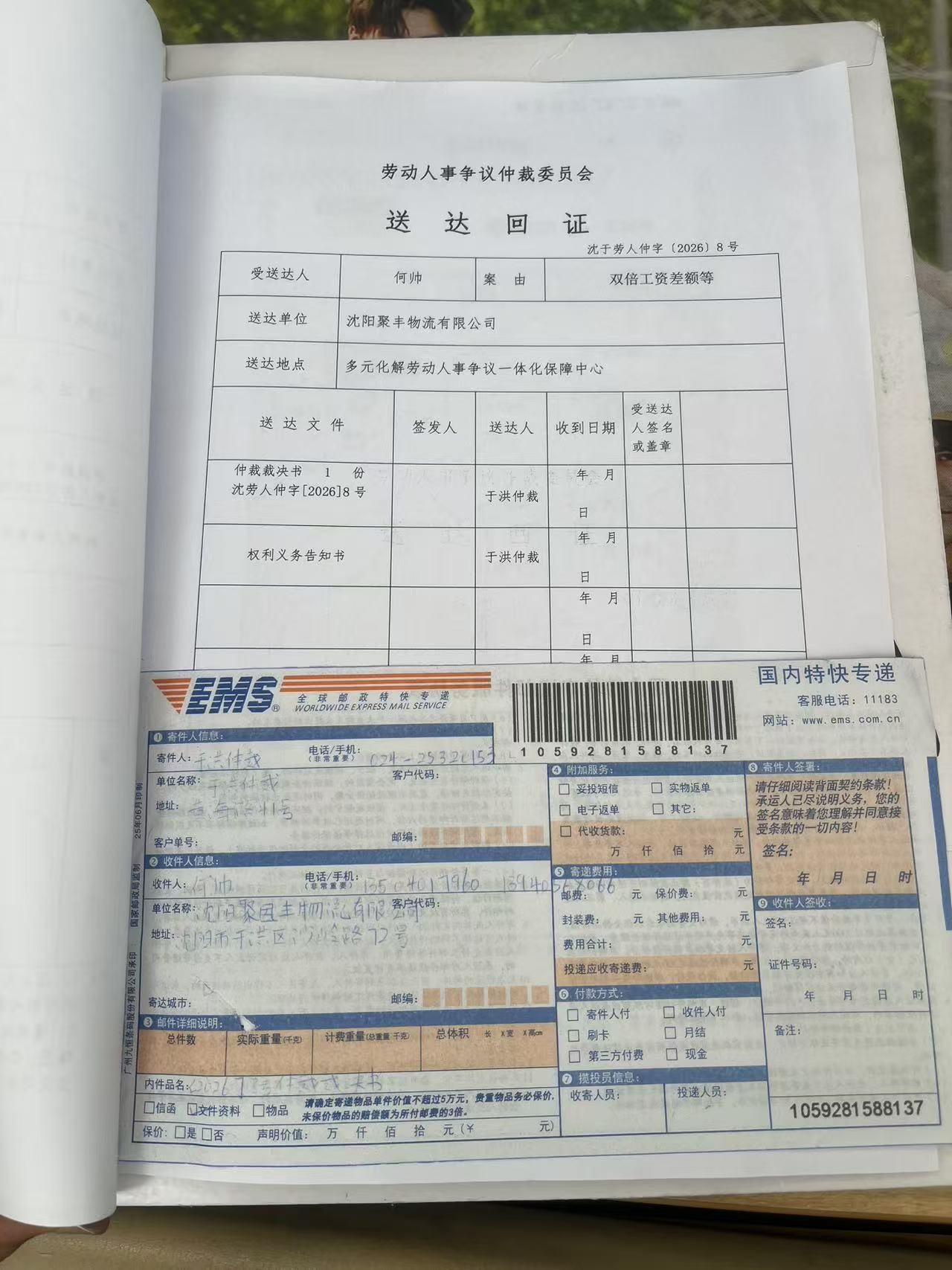 本委受理的王剑鸣与你单位双倍工资等争议一案,已作出仲裁裁决。因被申请人沈阳聚丰物流有限公司缺席,依据《中华人民共和国劳动法》第五十条、《中华人民共和国劳动合同法》第八十二条之规定,裁决如下:一、被申请人在本裁决书生效之日起十日内一次性支付申请人:双倍工资差额15633.34元(6500.00元÷30天×23天+6283.33元+4366.68元);二、申请人的其他请求本委不予支持。本裁决为终局裁决。
