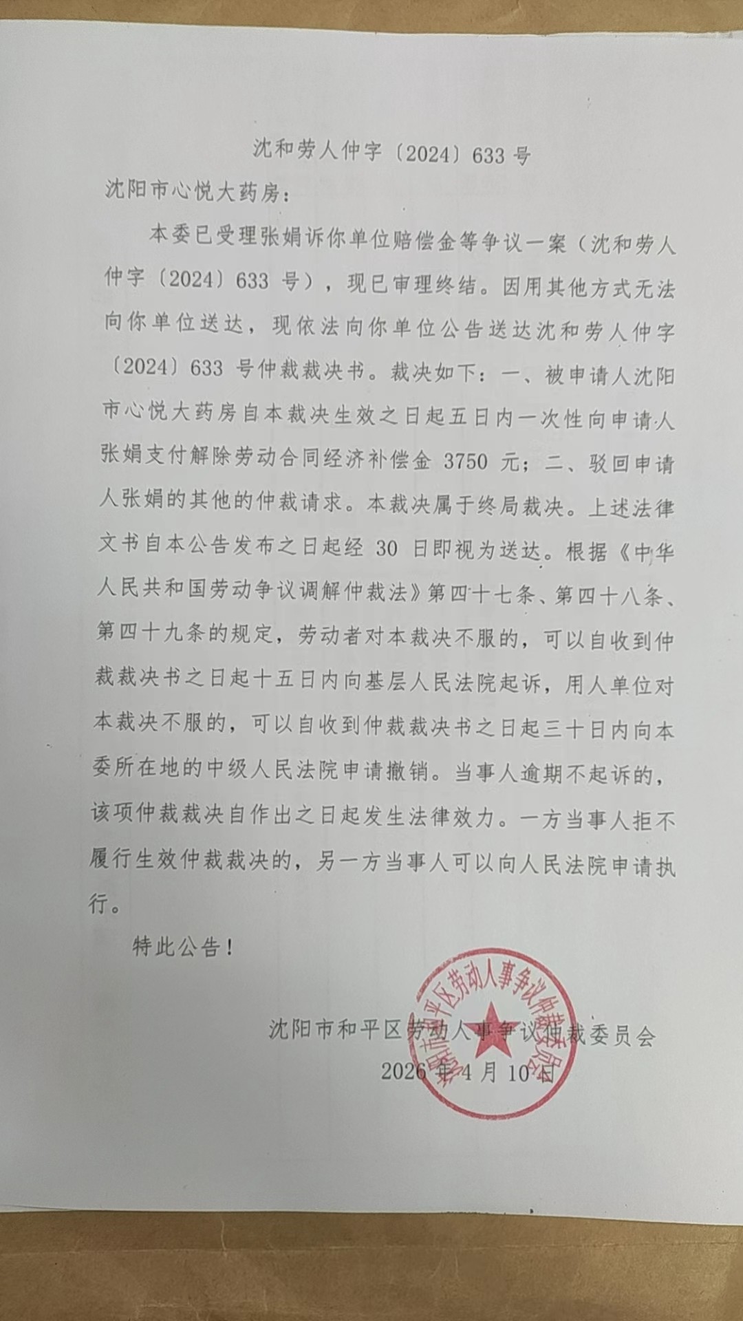 本委已受理张娟诉你单位赔偿金等争议一案(沈和劳人仲字〔2024〕633号),现已审理终结。因用其他方式无法向你单位送达,现依法向你单位公告送达沈和劳人仲字〔2024〕633号仲裁裁决书。裁决如下:一、被申请人沈阳市心悦大药房自本裁决生效之日起五日内一次性向申请人张娟支付解除劳动合同经济补偿金3750元;二、驳回申请人张娟的其他的仲裁请求。本裁决属于终局裁决。上述法律文书自本公告发布之日起经30日即视为送达。根据《中华人民共和国劳动争议调解仲裁法》第四十七条、第四十八条、第四十九条的规定,劳动者对本裁决不服的,可以自收到仲裁裁决书之日起十五日内向基层人民法院起诉,用人单位对本裁决不服的,可以自收到仲裁裁决书之日起三十日内向本委所在地的中级人民法院申请撤销。当事人逾期不起诉的,该项仲裁裁决自作出之日起发生法律效力。一方当事人拒不履行生效仲裁裁决的,另一方当事人可以向人民法院申请执行。