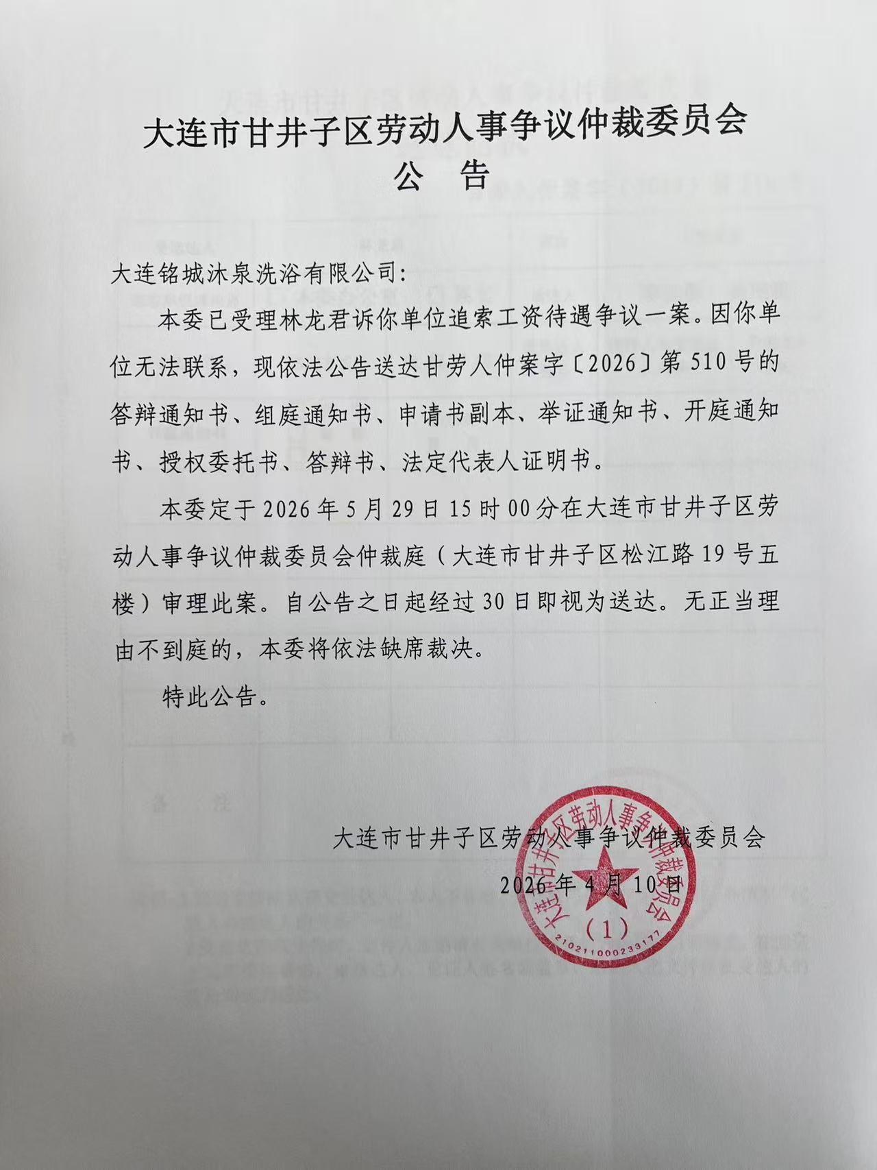 本委定于2026年5月29日15时00分在大连市甘井子区劳动人事争议仲裁委员会仲裁庭(大连市甘井子区松江路19号五楼)审理此案。自公告之日起经过30日即视为送达。无正当理由不到庭的,本委将依法缺席裁决。