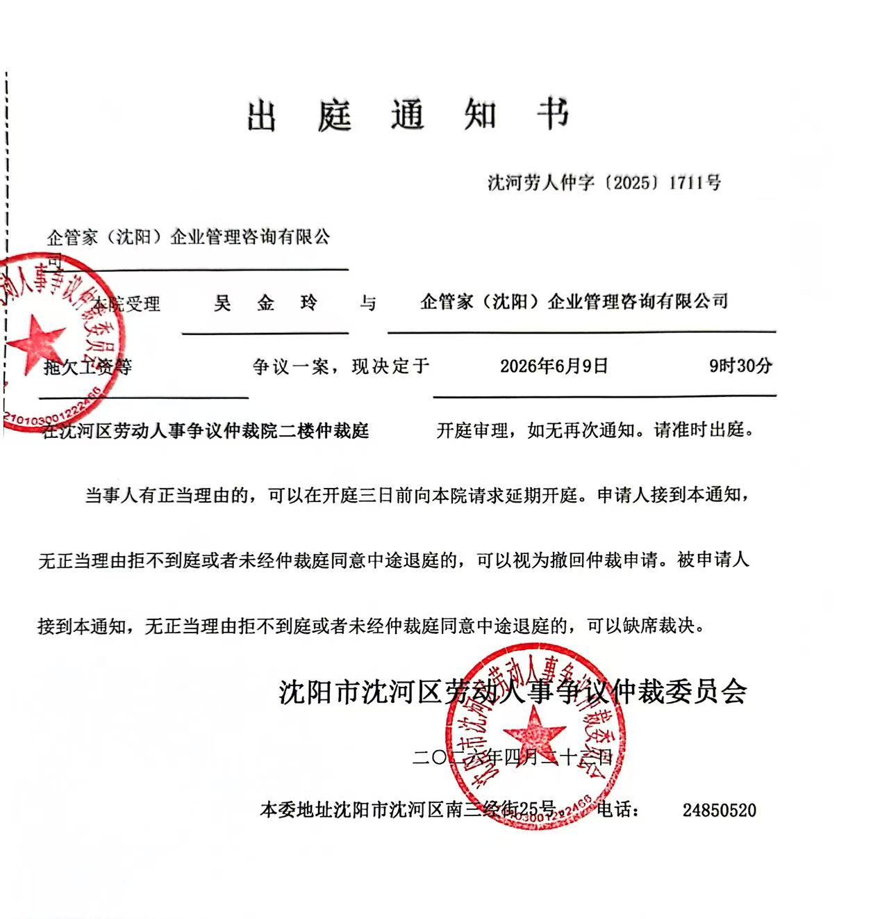 本委已受理吴金玲诉你公司拖欠工资等争议案(沈河劳人仲字[2025]1711号),因用其他方式无法向你公司送达,现依法向你公司公告送达应诉、举证、组庭人员(仲裁员:金水子,记录人员:唐庆博)及开庭通知书、申请书。上述法律文书自本公告发布之日起经30日即视为送达。提交答辩状和证据的期限为公告送达期满后15日内。本委定于2026年6月9日9时30分在沈阳市沈河区南三经街25号,沈河区劳动人事争议仲裁委员会二楼仲裁庭开庭审理。届时不到庭,本委将依法缺席裁决。