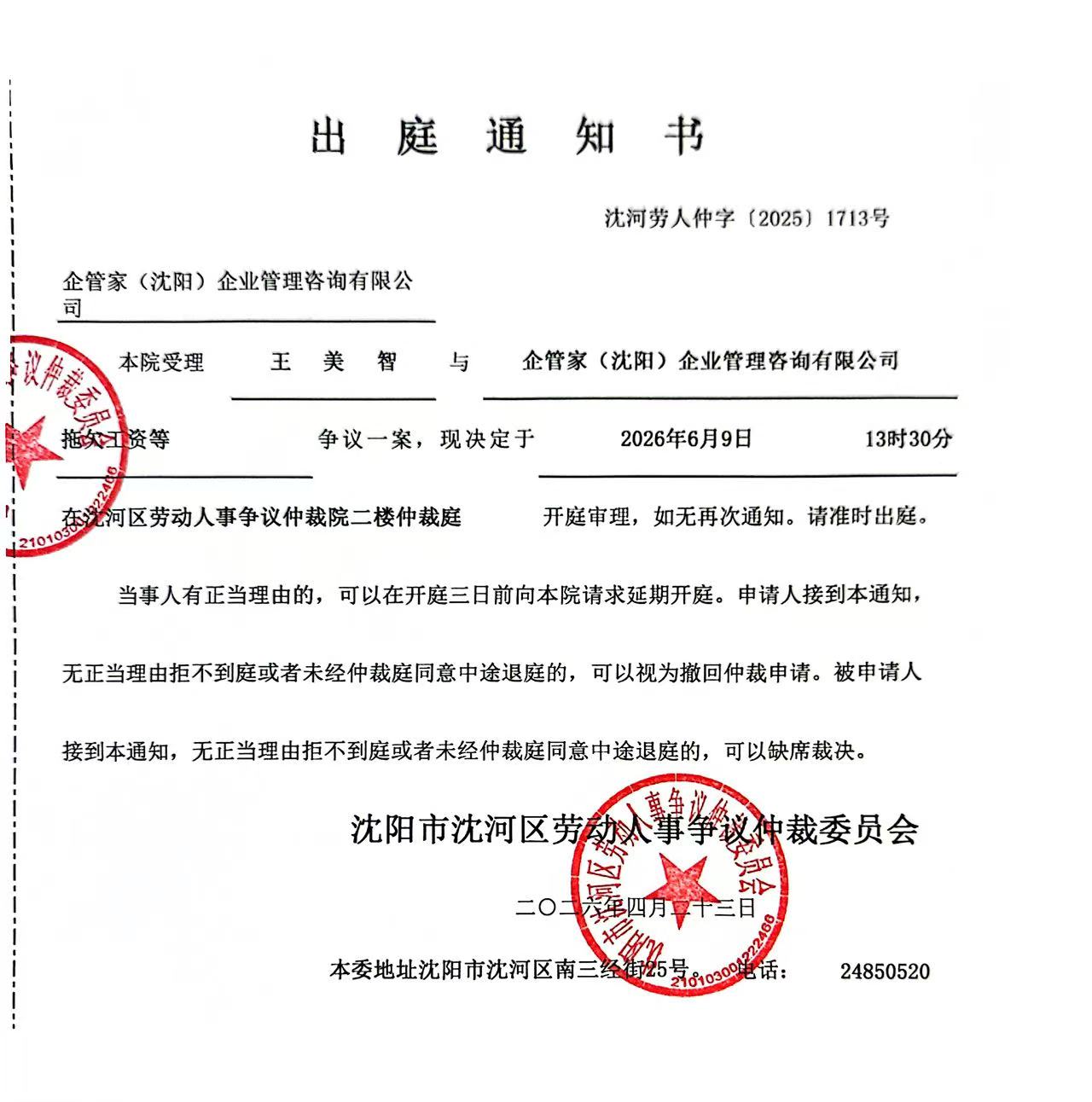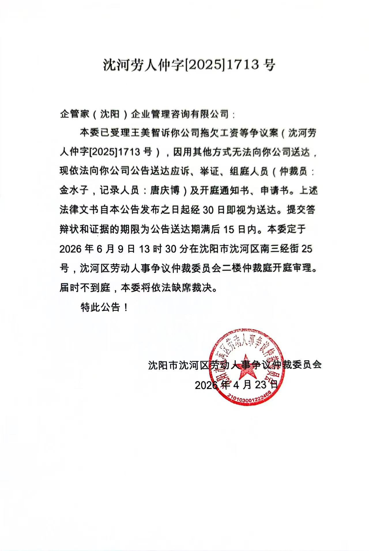 本委已受理王美智诉你公司拖欠工资等争议案(沈河劳人仲字[2025]1713号),因用其他方式无法向你公司送达,现依法向你公司公告送达应诉、举证、组庭人员(仲裁员:金水子,记录人员:唐庆博)及开庭通知书、申请书。上述法律文书自本公告发布之日起经30日即视为送达。提交答辩状和证据的期限为公告送达期满后15日内。本委定于2026年6月9日13时30分在沈阳市沈河区南三经街25号,沈河区劳动人事争议仲裁委员会二楼仲裁庭开庭审理。届时不到庭,本委将依法缺席裁决。