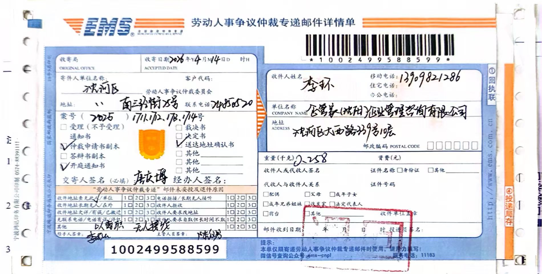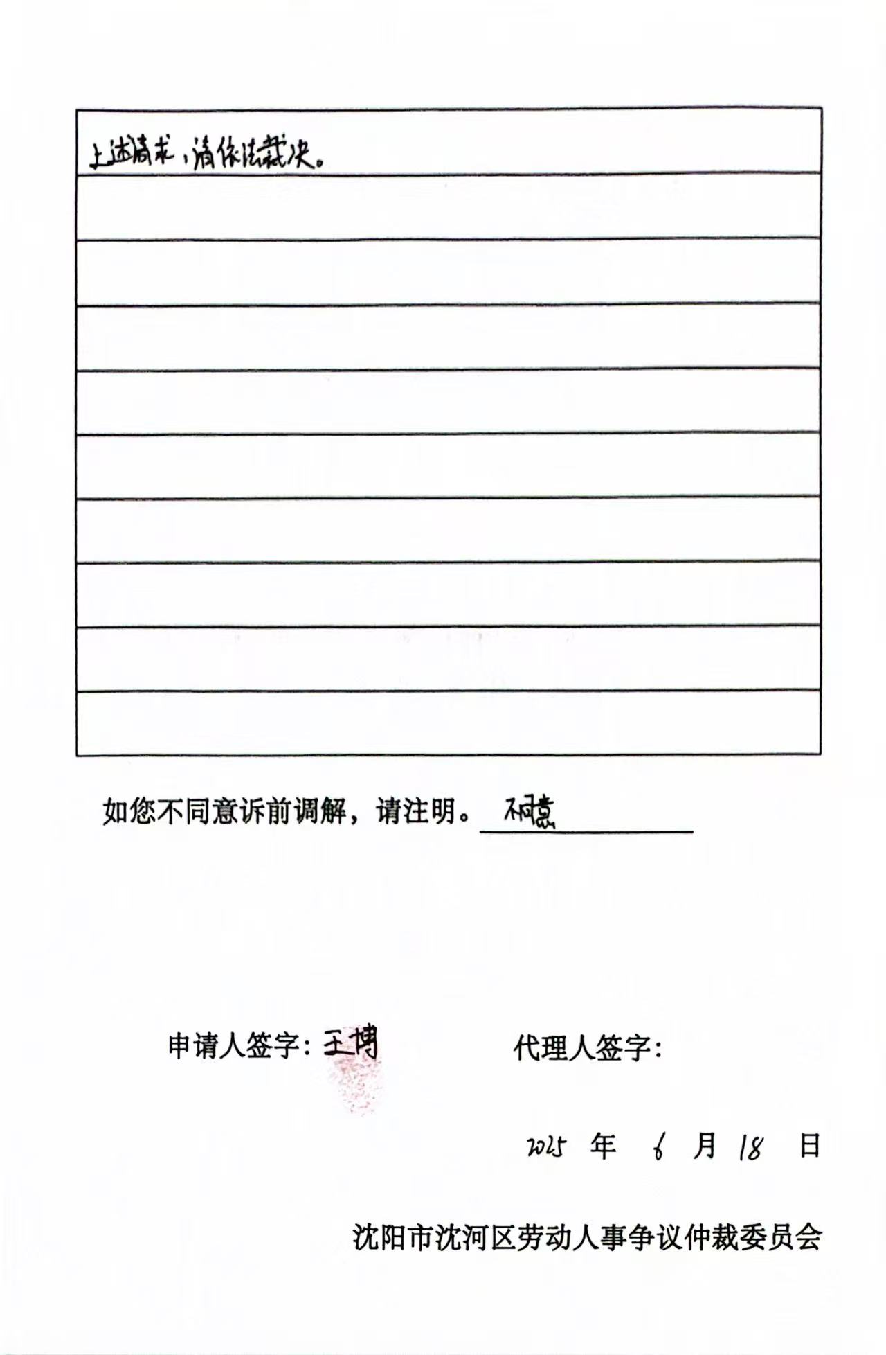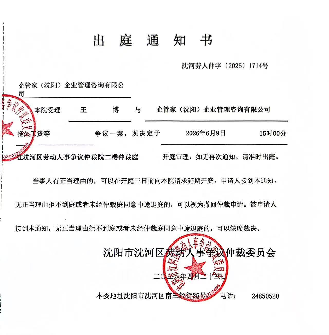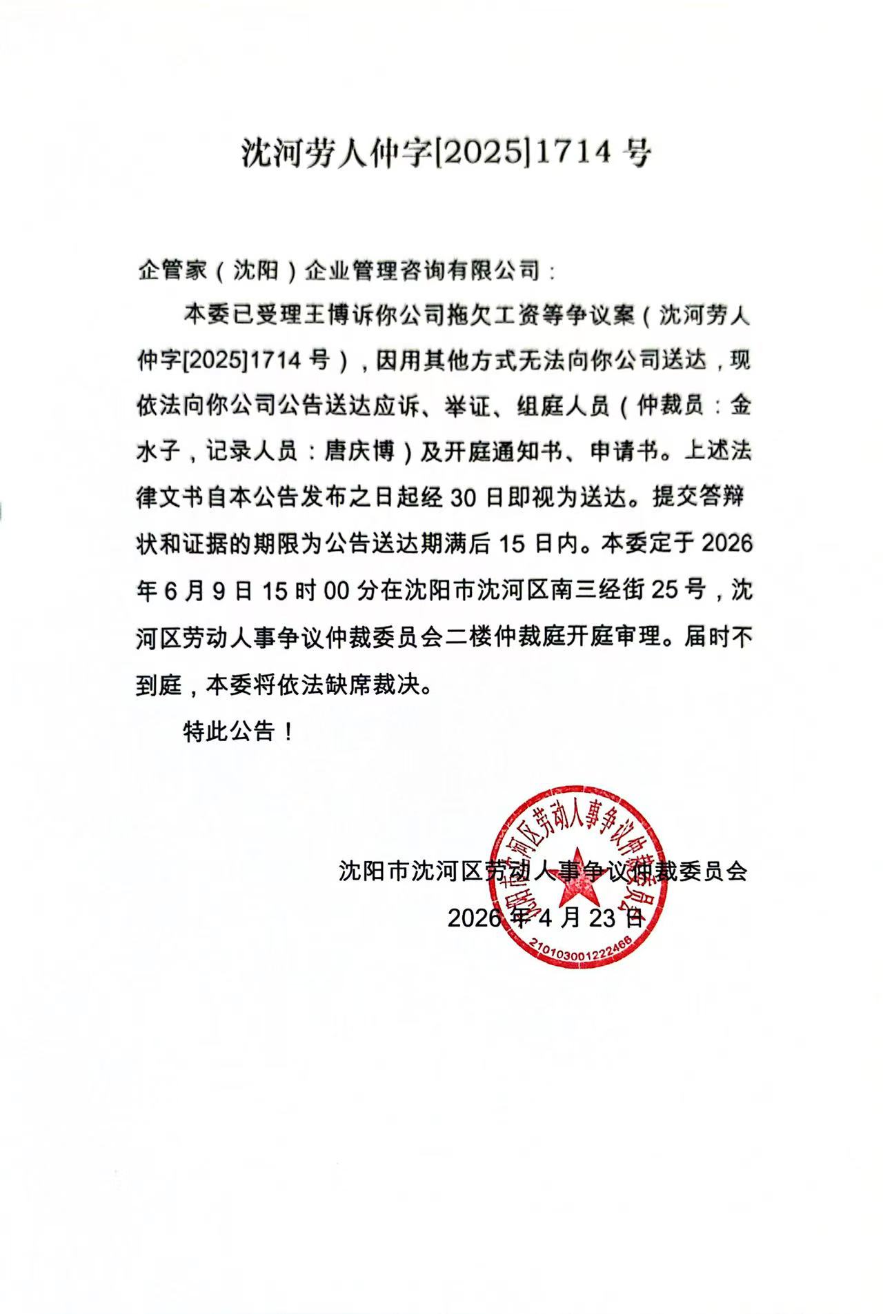 本委已受理王博诉你公司拖欠工资等争议案(沈河劳人仲字[2025]1714号),因用其他方式无法向你公司送达,现依法向你公司公告送达应诉、举证、组庭人员(仲裁员:金水子,记录人员:唐庆博)及开庭通知书、申请书。上述法律文书自本公告发布之日起经30日即视为送达。提交答辩状和证据的期限为公告送达期满后15日内。本委定于2026年6月9日15时00分在沈阳市沈河区南三经街25号,沈河区劳动人事争议仲裁委员会二楼仲裁庭开庭审理。届时不到庭,本委将依法缺席裁决。