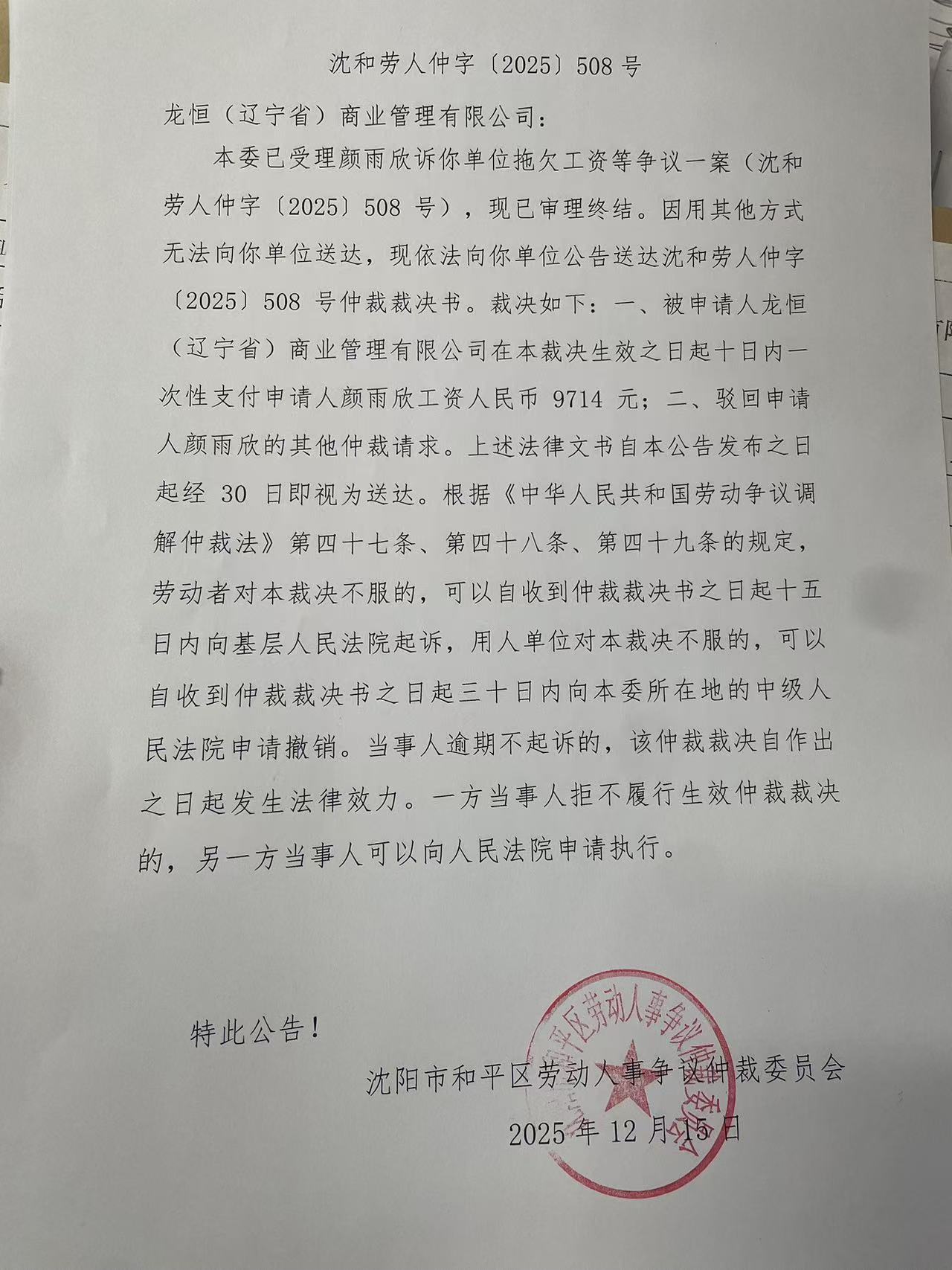 本委已受理颜雨欣诉你单位拖欠工资等争议一案(沈和劳人仲字〔2025〕508号),现已审理终结。因用其他方式无法向你单位送达,现依法向你单位公告送达沈和劳人仲字〔2025〕508号仲裁裁决书。裁决如下:一、被申请人龙恒(辽宁省)商业管理有限公司在本裁决生效之日起十日内一次性支付申请人颜雨欣工资人民币9714元;二、驳回申请人颜雨欣的其他仲裁请求。上述法律文书自本公告发布之日起经30日即视为送达。根据《中华人民共和国劳动争议调解仲裁法》第四十七条、第四十八条、第四十九条的规定,劳动者对本裁决不服的,可以自收到仲裁裁决书之日起十五日内向基层人民法院起诉,用人单位对本裁决不服的,可以自收到仲裁裁决书之日起三十日内向本委所在地的中级人民法院申请撤销。当事人逾期不起诉的,该仲裁裁决自作出之日起发生法律效力。一方当事人拒不履行生效仲裁裁决的,另一方当事人可以向人民法院申请执行。