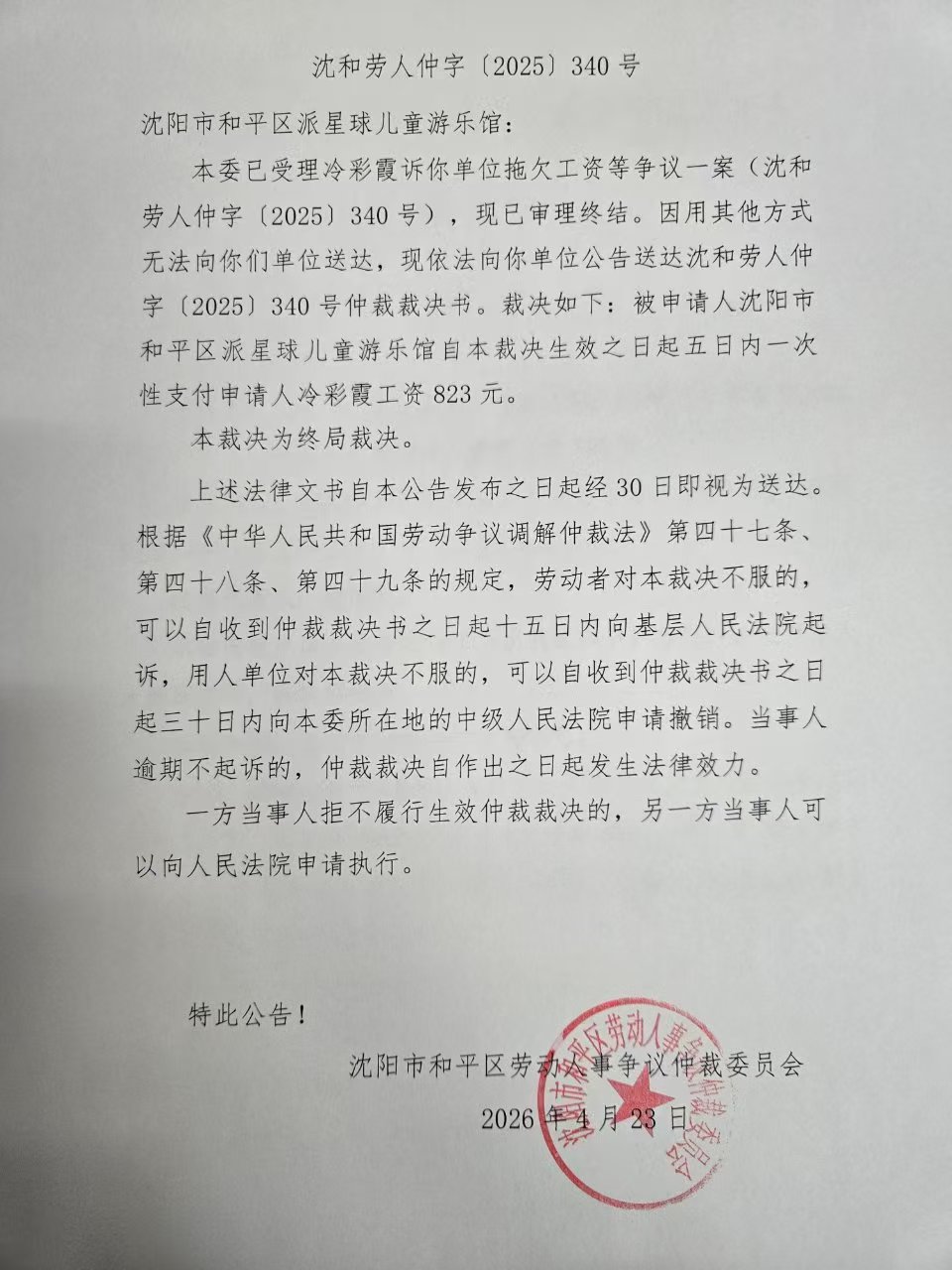 本委已受理冷彩霞诉你单位拖欠工资等争议一案(沈和劳人仲字〔2025〕340号),现已审理终结。因用其他方式无法向你们单位送达,现依法向你单位公告送达沈和劳人仲字〔2025〕340号仲裁裁决书。裁决如下:被申请人沈阳市和平区派星球儿童游乐馆自本裁决生效之日起五日内一次性支付申请人冷彩霞工资823元。