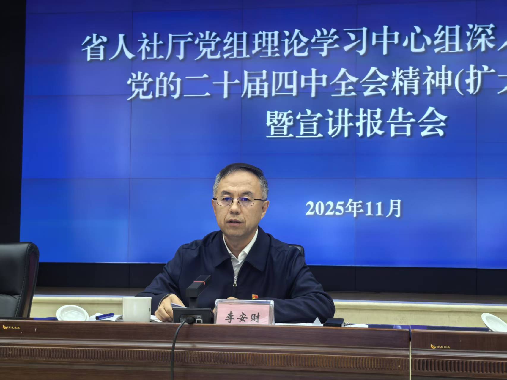 11月14日,省人力资源社会保障厅召开厅党组理论学习中心组深入学习贯彻党的二十届四中全会精神(扩大)会议暨宣讲报告会。厅党组书记、厅长李安财主持会议并作专题宣讲,各位中心组成员结合分管工作作交流发言。会议以电视电话会议形式召开,厅机关全体公务员,厅属各单位全体人员参会。
