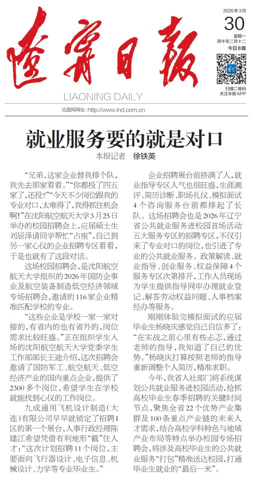 这场校园招聘会,是沈阳航空航天大学组织的2026年国防企事业及航空装备制造低空经济领域专场招聘会,邀请的116家企业精准匹配学校的专业。