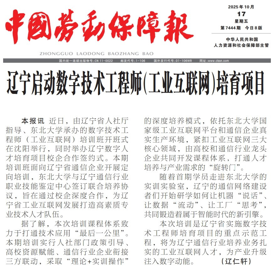【中国劳动保障报】辽宁启动数字技术工程师(工业互联网)培育项目